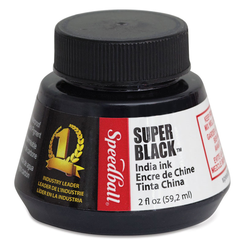 Made from highly opaque, carbon black pigment, this ink offers excellent reproduction quality on absorbent surfaces with optimum lightfastness. Thus the term “super black.” Which means its blackness will be very permanent and fadeless. Easily applied by pen, brush, steel brush or airbrush, Speedball’s India Ink is free-flowing, non-clogging and waterproof. Super Black ink has excellent reproducing qualities on paper and most plastic drafting surfaces. Plastic shatter resistant containters. Made from 100% carbon black pigment.